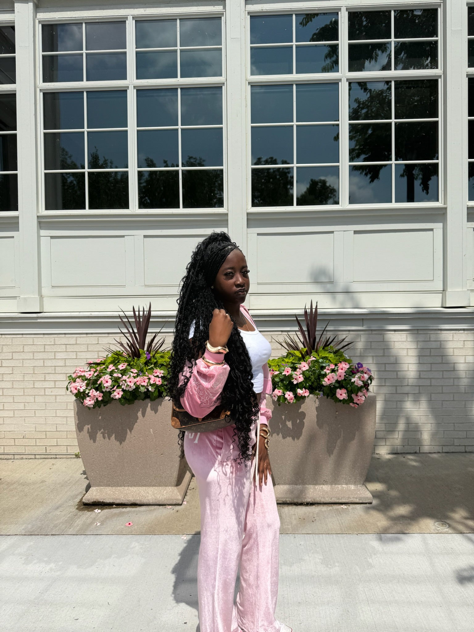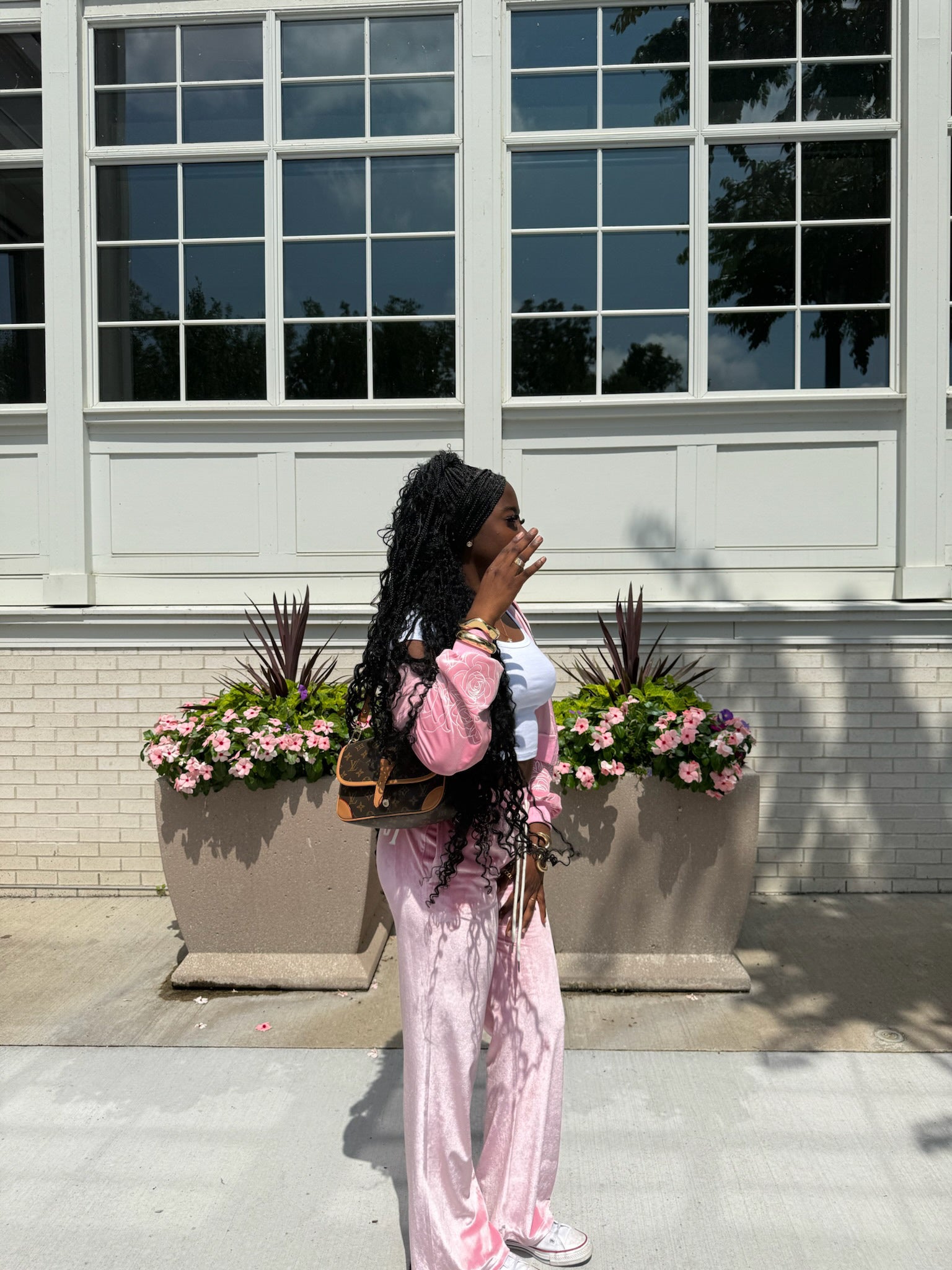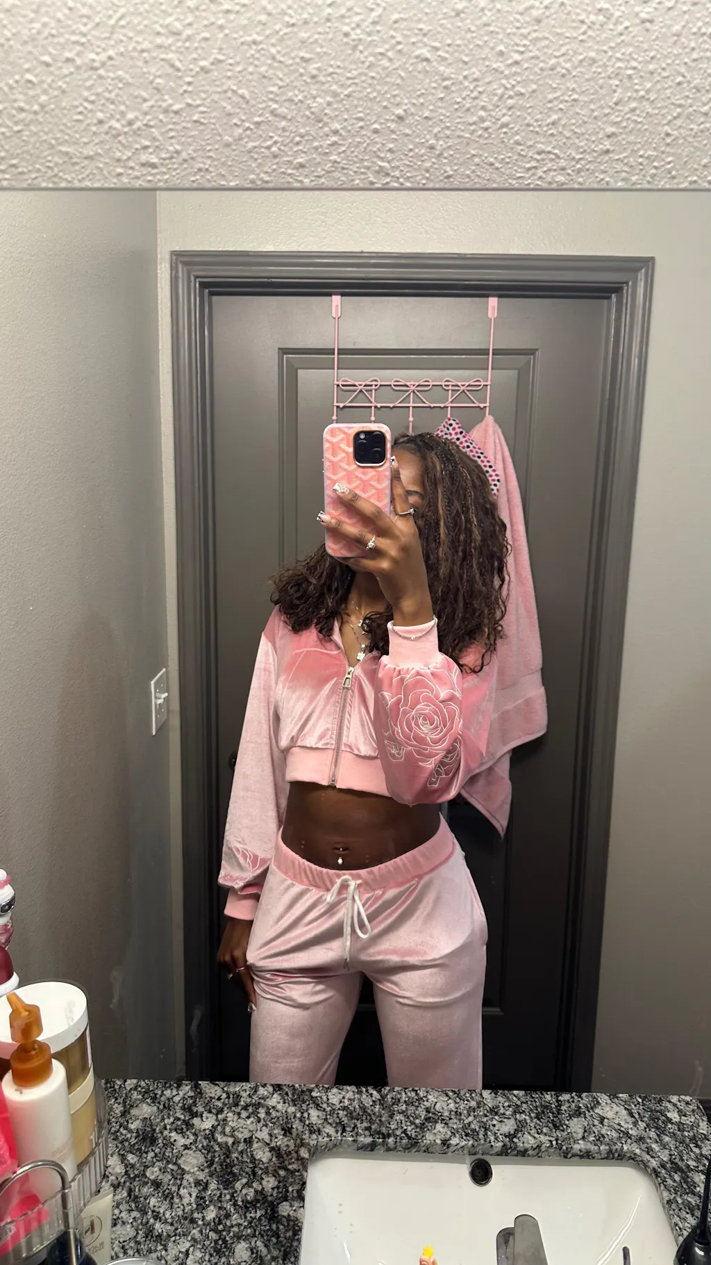 The drawstring pants are made from matching plush pink velvet, offering a comfortable fit with a sleek, elongated silhouette. The flared design adds a relaxed, cozy vibe while maintaining a flattering drape. On the back, bold white lettering spells out TREASUREST giving the pants a standout, signature touch that ties the set together with the hoodie.