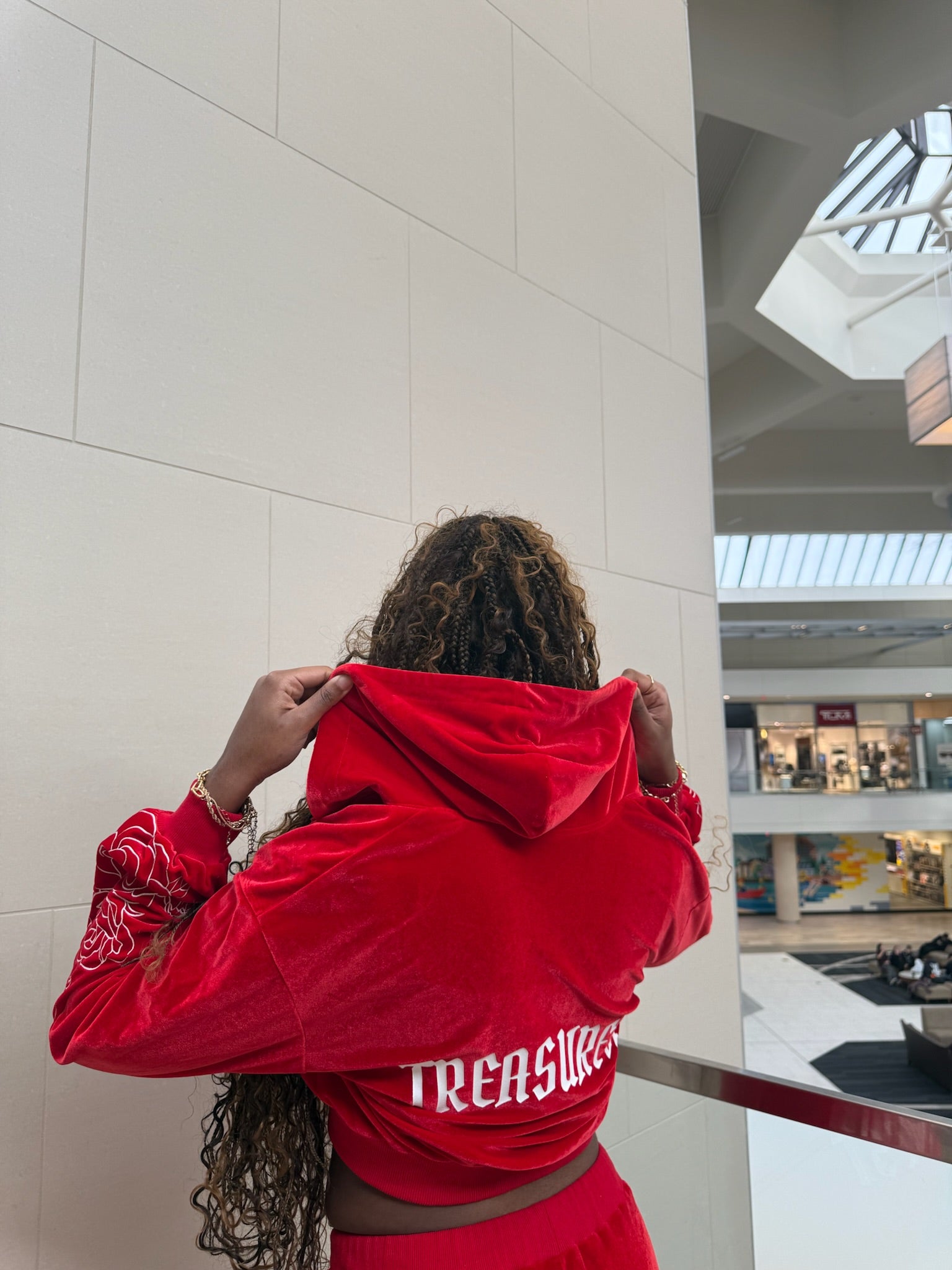 This cropped hoodie is crafted from soft, shimmering red velvet for a luxe yet cozy feel. Designed with a relaxed fit and ribbed cuffs, it features embroidered floral details on the sleeves that elevate its feminine edge. With bold TREASUREST branding on the back to make the piece a true statement.